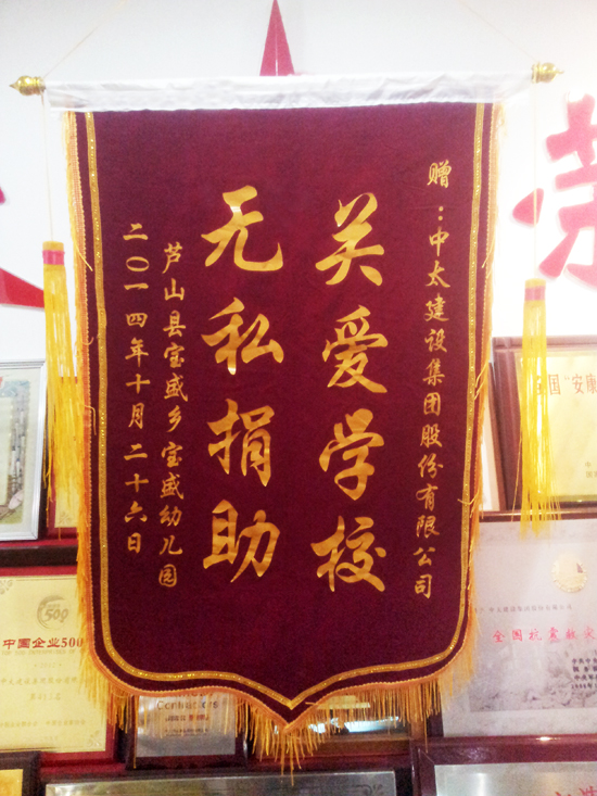 12月12日上午,中太建設(shè)集團收到來自四川蘆山縣寶盛鄉(xiāng)幼兒園送來的錦旗,其內(nèi)容為“關(guān)愛學(xué)校無私捐助”,以感謝集團公司在幼兒園援建工作中做出的貢獻(xiàn)。