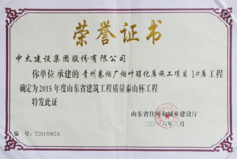 “泰山杯”獎是山東省建筑行業工程質量方面的最高榮譽獎,由山東省建設廳、山東省建筑工程管理局、山東省建筑業聯合會頒發。獲獎工程位于山東省青州市玲瓏山北路1818號,項目總投資6700萬元,建筑內容為41196平方米煙葉醇化庫主體和部分配套項目,工程自2012年11月20日開工建設,于2013年11月20日竣工驗收完成。