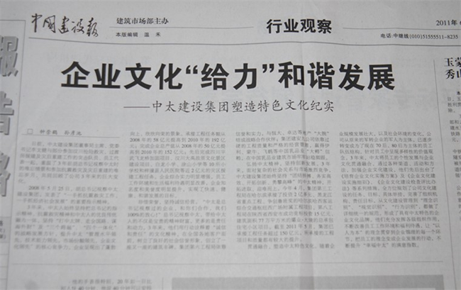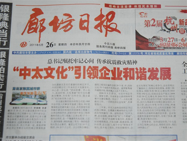 近日,中國建設報、文匯網、河北經濟日報、長城網、廊坊日報等多家媒體對公司三年來銘記胡錦濤總書記視察中太囑托、弘揚抗震救精神,創新發展,銳意進取所取得的豐碩成果進行集中報道,擴大了企業知名度,提升了中太品牌的社會影響力。