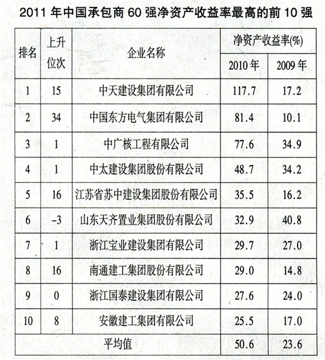 2011ENR/建筑時(shí)報(bào)“中國(guó)承包商和工程設(shè)計(jì)企業(yè)雙60強(qiáng)”榜單于11月16日正式發(fā)布。中太建設(shè)集團(tuán)以2010年48.7%的凈資產(chǎn)收益率排名中國(guó)承包商60強(qiáng)第四位,較2009年34.2%的比率,排名上升了一位。